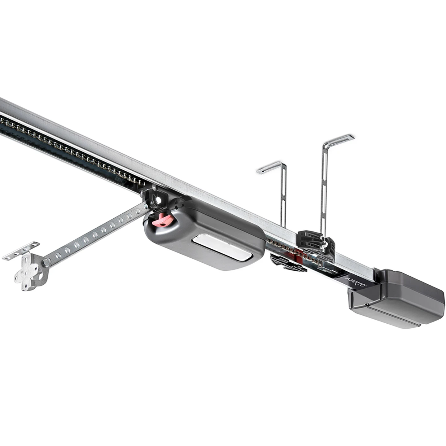 In dem unter der Marke Aperto angebotenen Garagentorantrieb A550 L steckt eine langjährig entwickelte und bewährte Antriebstechnik. So funktioniert auch dieser nach dem Prinzip eines Deckenschlepper-Antriebs. Dies bedeutet, dass die eigentliche Antriebseinheit, der Laufwagen, selbst mit dem Tor mitfährt. Die Antriebskette, welche bei vielen anderen Herstellern das Tor zieht, ist beim Deckenschlepper dagegen feststehend aufgespannt. Der Vorteil dieser Kombination aus beweglicher Antriebseinheit und feststehender Kette besteht darin, dass dieses Prinzip wartungsfrei, leise und verschleißarm ist. So ist es z. B. nicht notwendig die Kette oder die Laufschiene in regelmäßigen Abständen zu ölen. Auf der anderen Seite halten die Antriebe in der Regel auch länger als vergleichbare herkömmliche Garagentorantriebe mit bewegliche Kette.