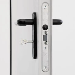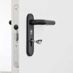 | Drückerausführung: | Drückergarnitur Typ D-110, mit Kurzschild, Kunststoff schwarz, U-Form, mit Stahlkern, für Profilzylinder und Buntbartschlüssel, lose beigelegt |