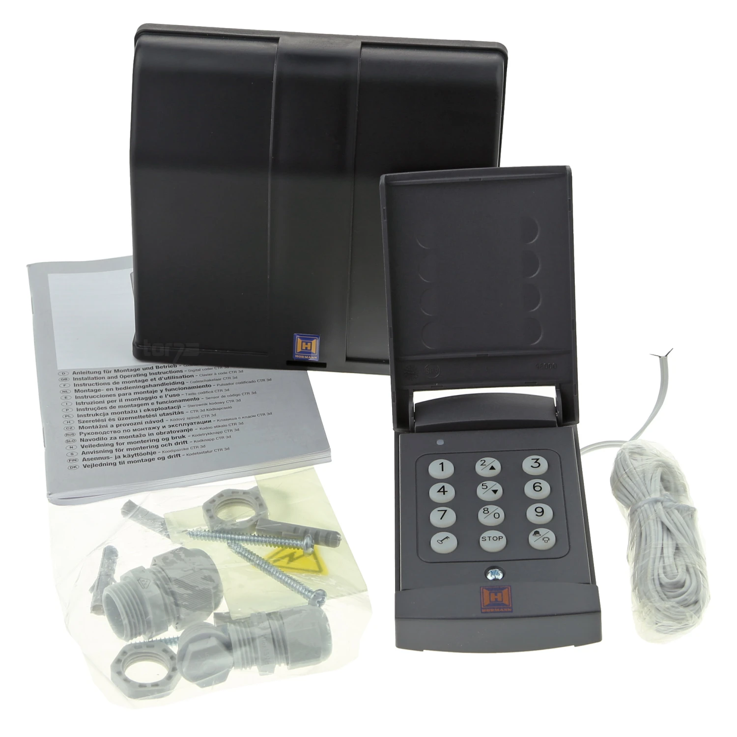 Außer der Bedienungsanleitung erhalten Sie bei der Bestellung von einem CTR 3d die Auswerteeinheit und die Eingabeeinheit mit Tastatur. An dieser ist ein 5 m langes Verbindungskabel zur Auswerteeinheit befestigt, welches noch bis auf 20 m verlängert werden kann. Für die Verbindung von der Auswerteeinheit zum Antrieb oder die Stromversorgung mit 24 V eignet sich eine Anschlussleitung ASL, welche auf Anfrage in Längen 2 m, 10 m oder 50 m (auf Rolle) bei uns erhältlich ist. Für die Stromversorgung mit 230 V kommen die Hörmann Anschlussleitung ZL 1 oder die Hörmann Anschlussleitung ZLE 1 infrage. Die robuste Tastatur ist modern gestaltet und lediglich 76 x 76 x 13 mm groß. Der CTR 3d kann alle Hörmann-Antriebe, Antriebe anderer Hersteller oder elektrische Türöffner steuern.