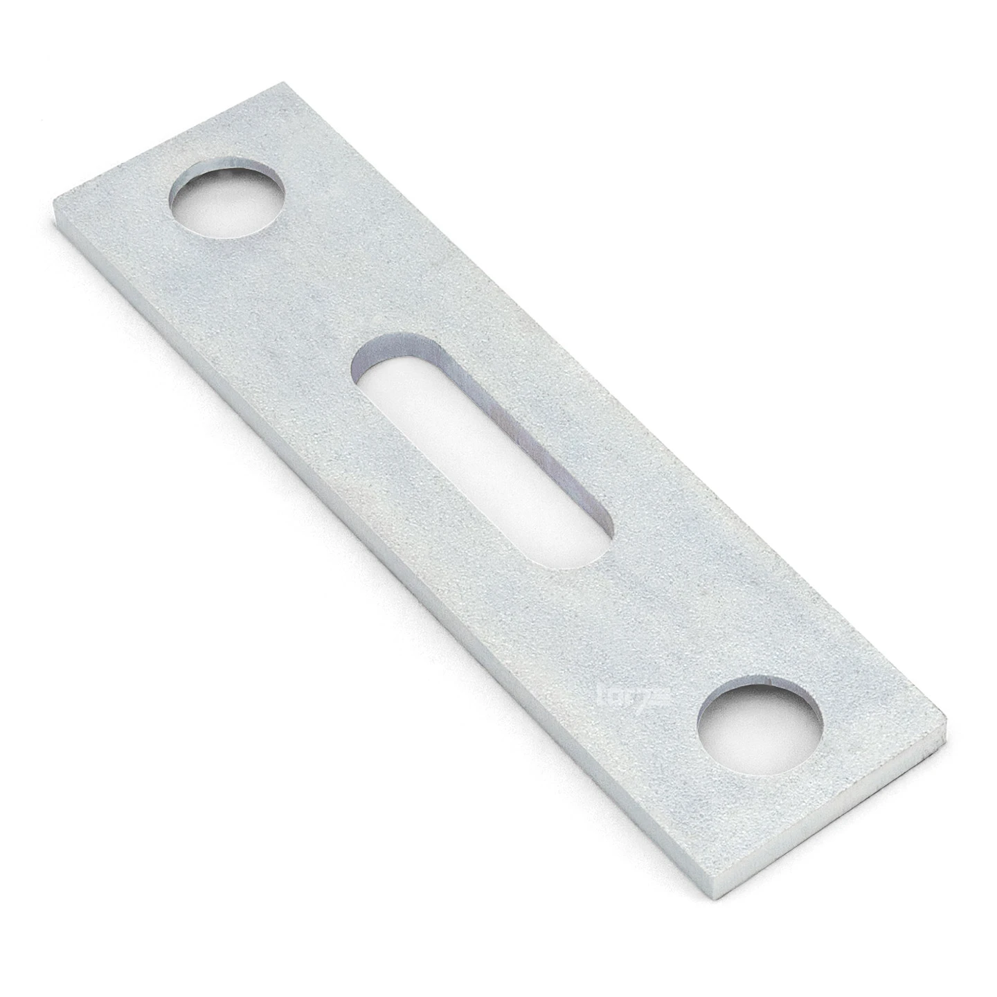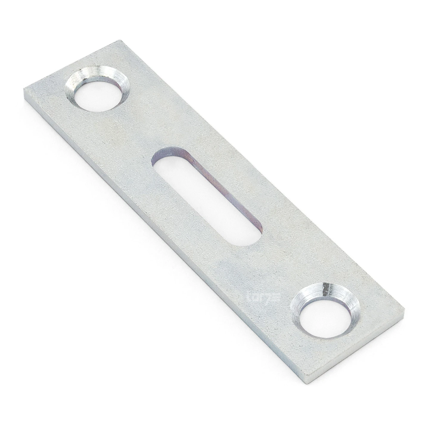 Das Verschlussstück ist eine 150 x 40 mm messende Platte aus verzinktem Stahl, die mit drei Öffnungen versehen ist. Die beiden äußeren runden Schraublöcher dienen zur Verankerung des Bauteils im Boden. Das dritte in der Mitte liegende Loch ist zur Aufnahme der vom Tor kommenden Verschlussstangen vorgesehen. Allgemein ist das Hörmann unteres Verschlussstück, verzinkt dabei vor allem auf die rechteckigen 20 x 10 mm messenden Verschlussstäbe der Stahl-Falttore optimiert.